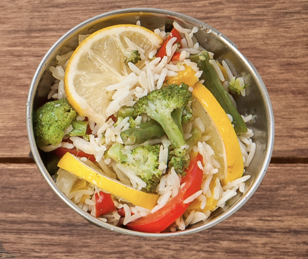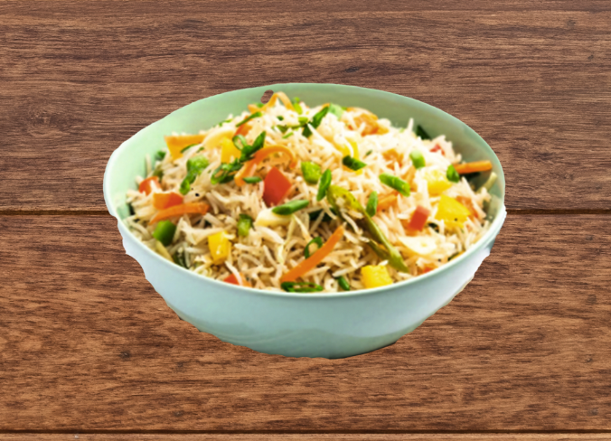 Cooked rice has been stir-fried with oil, spice and mixed vegetables.