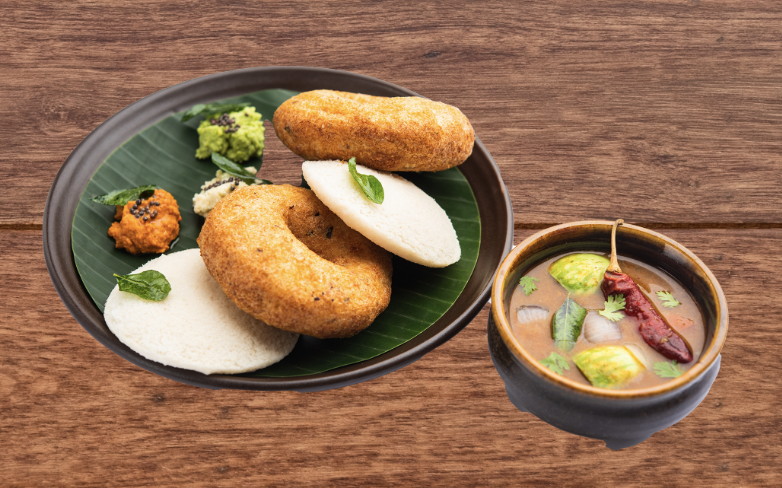 Steamed rice cake and deep fried lentil doughnut served with chutneys and sambar.